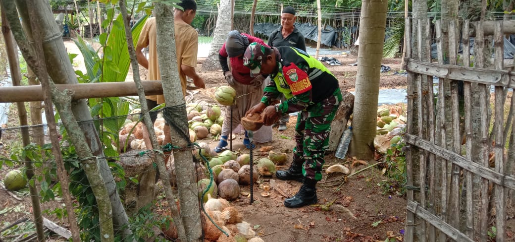 Pada kesempatan tersebut, Kopda Hendri mengikuti warganya dalam kegiatan mengupas kelapa di mana mulai proses pengambilan buah, di kumpul buah kelapa dan lanjut proses pengupasan sabut kelapa yang nantinya akan di jual ke pada pengepul yang ada di sana.