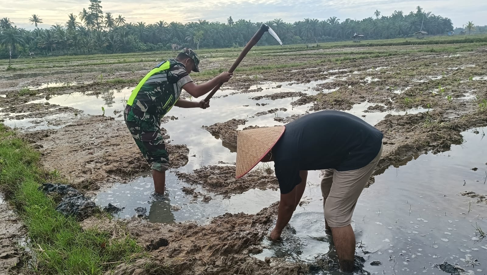Awalnya, Sertu Suherdi sedang melaksanakan kegiatan monitoring wilayah dan melihat salah satu mitra karibnya tengah mengolah lahan. Tanpa menunggu komando, ia segera mendekat dan ikut membantu proses pembajakan sawah menggunakan cangkul, meski seragam lorengnya harus kotor oleh lumpur.